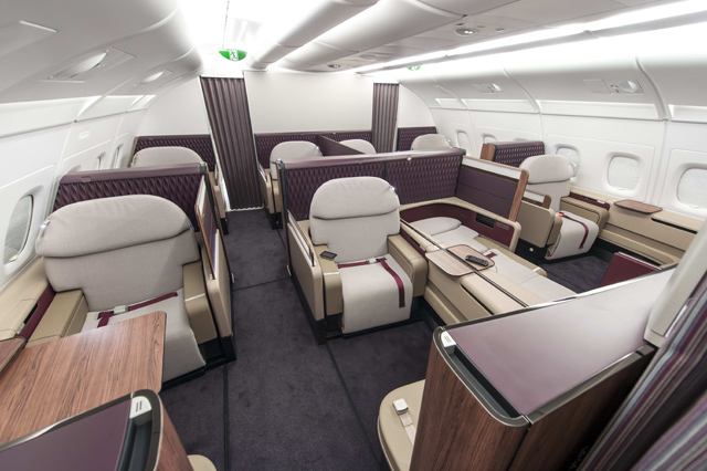 The eight-seat first-class cabin is at the front of the upper deck and features a brand new lie-flat design offering 90in (229cm) pitch and equipped with a 48cm screen. The A380 is expected to be the only aircraft in Qatar’s fleet to feature a first-class cabin once its four A340-600s have been retired.